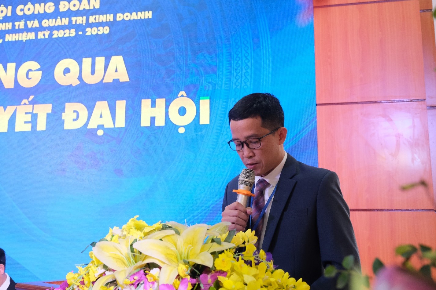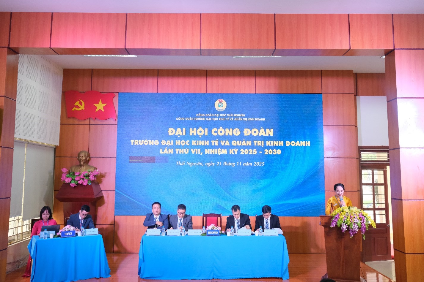 Trong phát biểu chỉ đạo Đại hội, đồng chí Phó Chủ tịch Công đoàn Đại học Thái Nguyên Nguyễn Ánh Nguyệt đã ghi nhận, đánh giá cao những thành tích xuất sắc của Công đoàn Trường Đại học Kinh tế và Quản trị kinh doanh trong giai đoạn 2023 - 2025 thuộc nhiệm kỳ 2025 - 2028; đánh giá cao những nhiệm vụ trọng tâm gắn với đổi mới giáo dục đại học đã được xác định trong phương hướng, nhiệm vụ của nhiệm kỳ mới; đồng thời, gợi mở thêm một số định hướng trong công tác Công đoàn của Trường cho nhiệm kỳ tới.