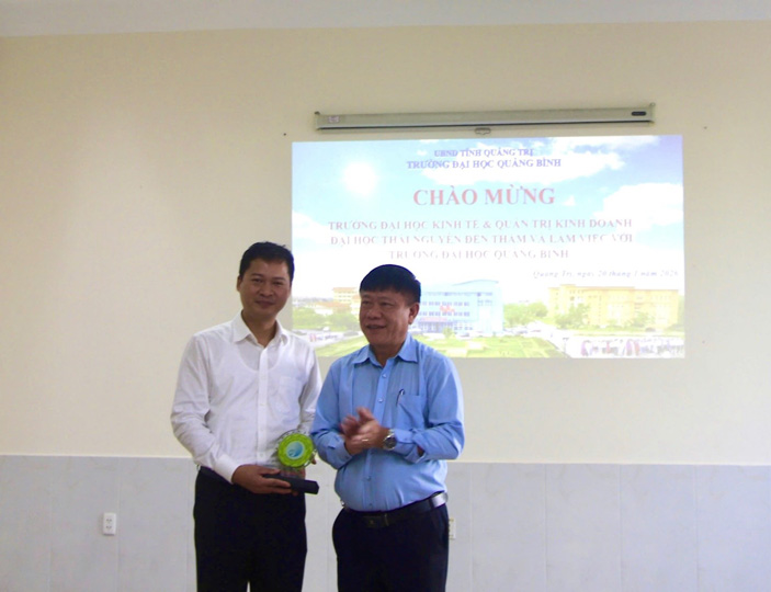 20/01/2026Ngày 19/01/2026, Đoàn công tác của Trường Đại học Kinh tế và Quản trị kinh doanh (TUEBA) do PGS.TS. Đinh Hồng Linh - Phó Bí thư Đảng ủy, Hiệu trưởng Nhà trường làm Trưởng đoàn đã đến thăm và làm việc tại Trường Đại học Quảng Bình.