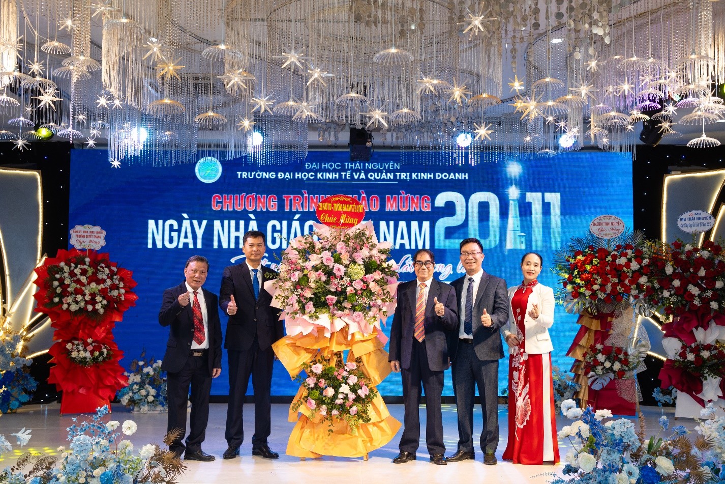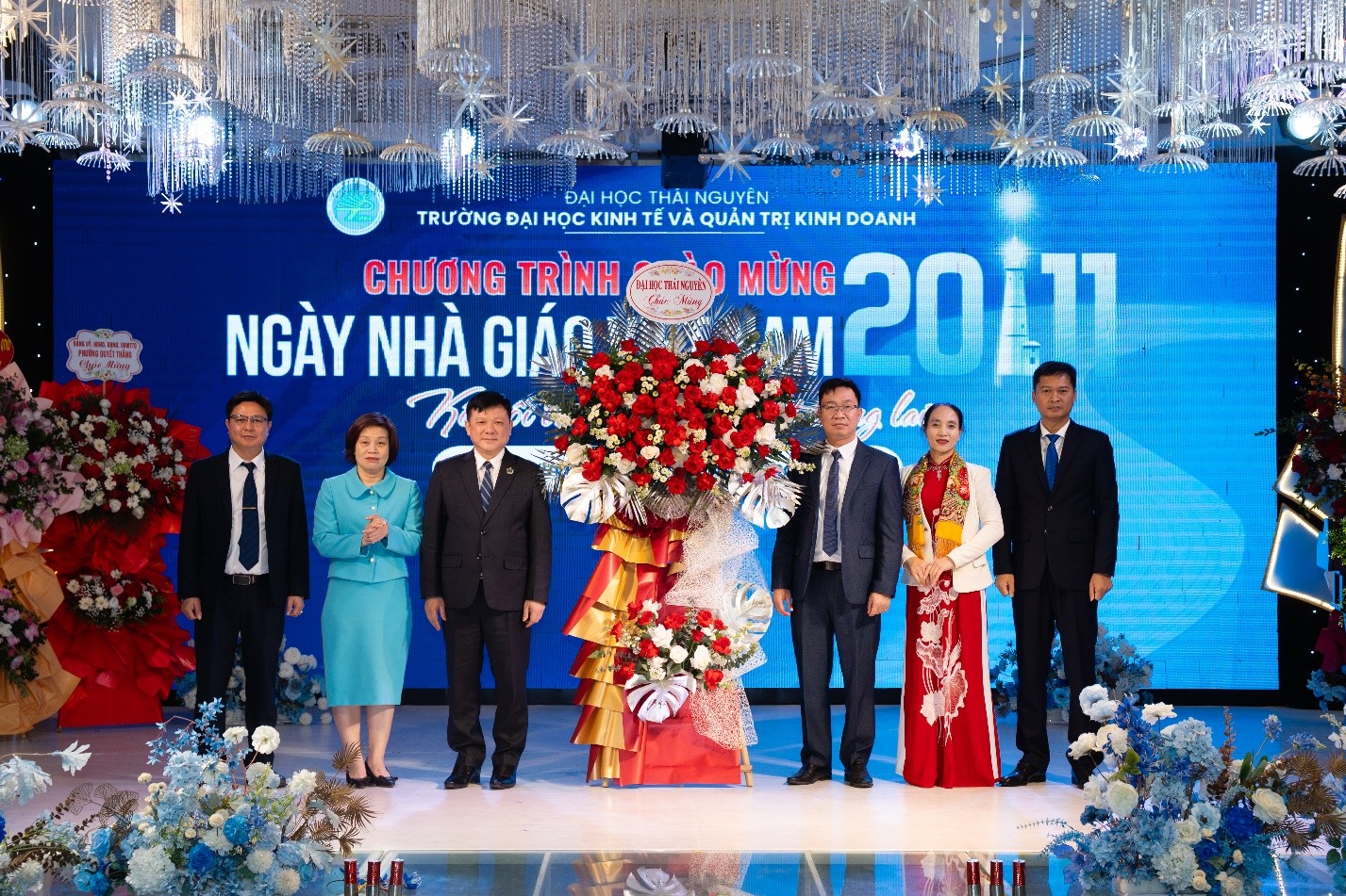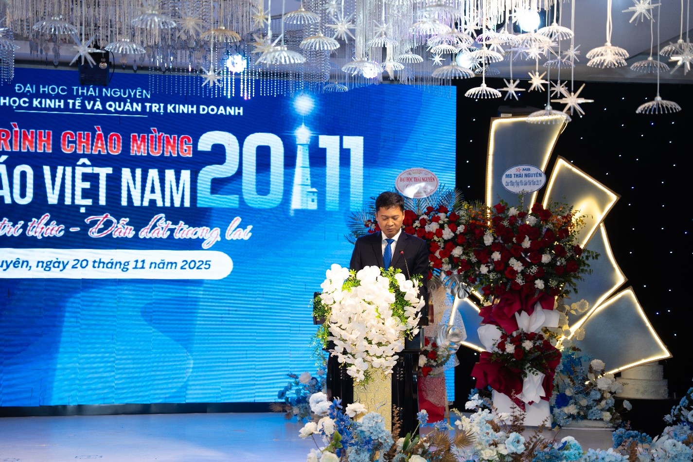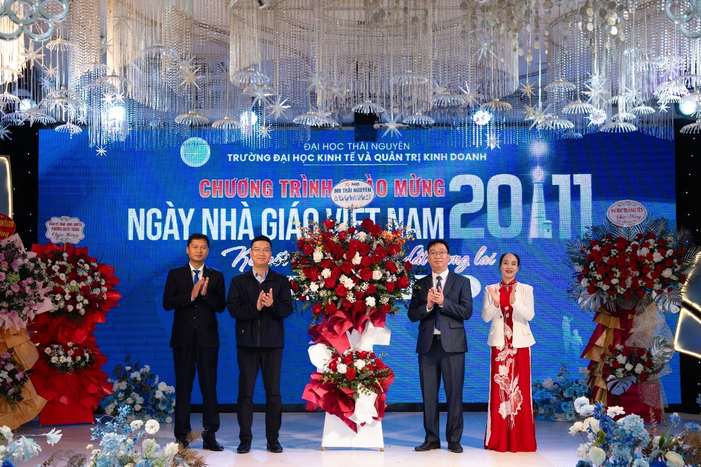 Tiếp đó, PGS.TS Phạm Văn Hùng - Giám đốc Đại học Thái Nguyên đã chúc mừng TUEBA và ghi nhận những kết quả nổi bật trong năm qua. Đồng chí đánh giá cao sự mạnh dạn đổi mới của Nhà trường, đặc biệt là việc tái cấu trúc bộ máy theo hướng tinh gọn, hiệu quả, gắn với xu thế phát triển chung của xã hội; đồng thời ghi nhận nỗ lực chuyển đổi chương trình đào tạo, mở mới các ngành phù hợp nhu cầu thị trường, tăng cường hợp tác doanh nghiệp và nâng cao chất lượng giảng dạy. Đồng chí cũng gửi tặng lẵng hoa tươi thắm chúc mừng Nhà trường nhân Ngày Nhà giáo Việt Nam.