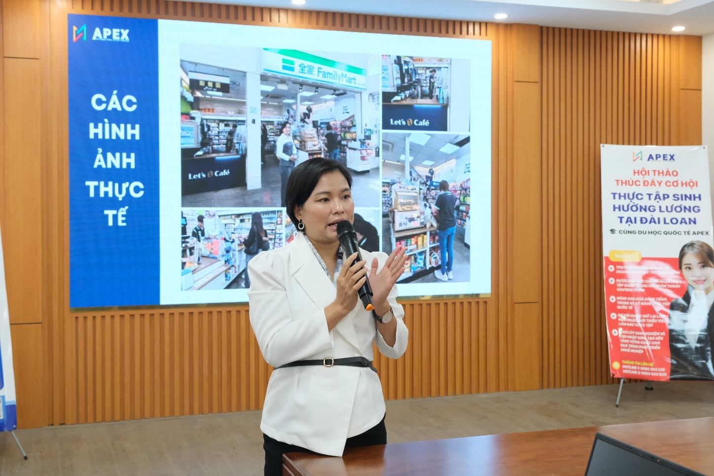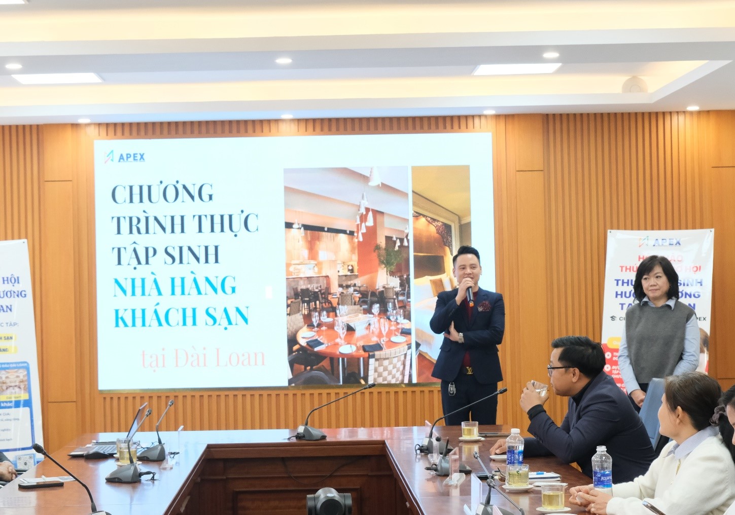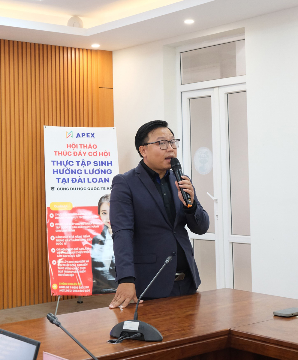 Tại hội thảo, bà Phạm Thị Nguyệt - Giám đốc Kinh doanh Apex đã giới thiệu chi tiết chương trình thực tập sinh hưởng lương tại Đài Loan trong lĩnh vực Nhà hàng - Khách sạn, với nhiều thông tin cụ thể về vị trí thực tập, điều kiện tham gia, chế độ đãi ngộ và cơ hội phát triển nghề nghiệp dành cho sinh viên TUEBA.