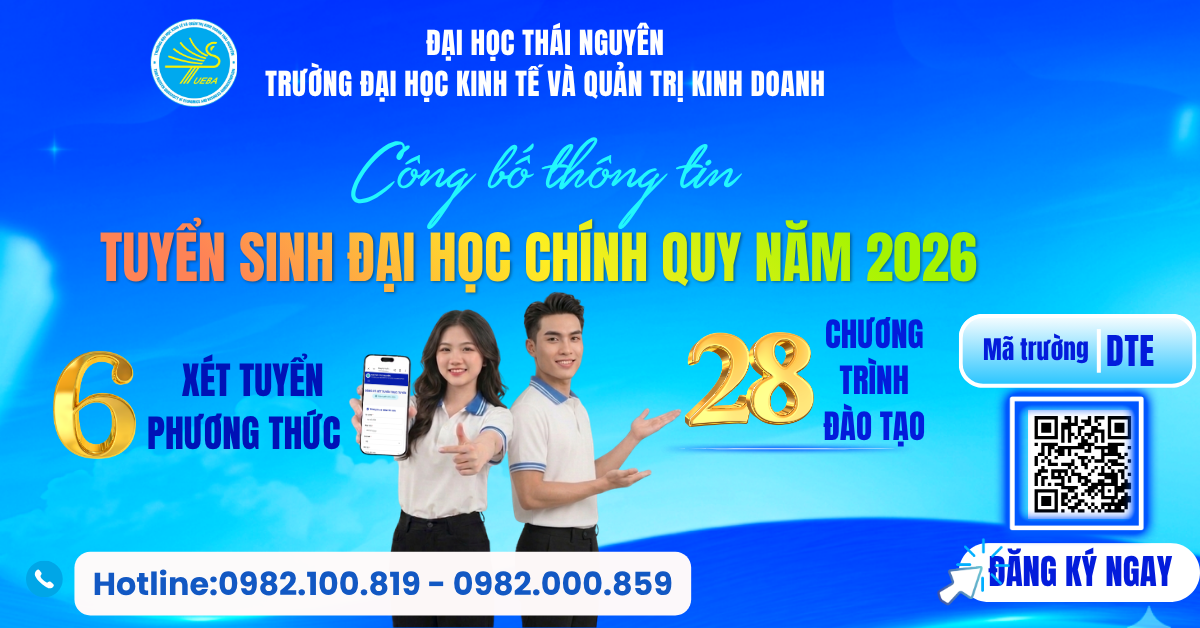 Trường đại học Kinh tế và Quản trị kinh doanh - Đại học Thái Nguyên (mã trường DTE). Tuyển sinh 3500 chỉ tiêu năm 2026 cho 28 ngành/chương trình đào tạo đại học (có 04 chương trình đào tạo dạy và học bằng Tiếng Anh và 02 chương trình đào tạo dạy và học bằng Tiếng Trung Quốc) với 06 phương thức xét tuyển, đáp ứng nhu cầu học tập và phát triển nghề nghiệp của người học trong bối cảnh nền kinh tế số và hội nhập quốc tế.