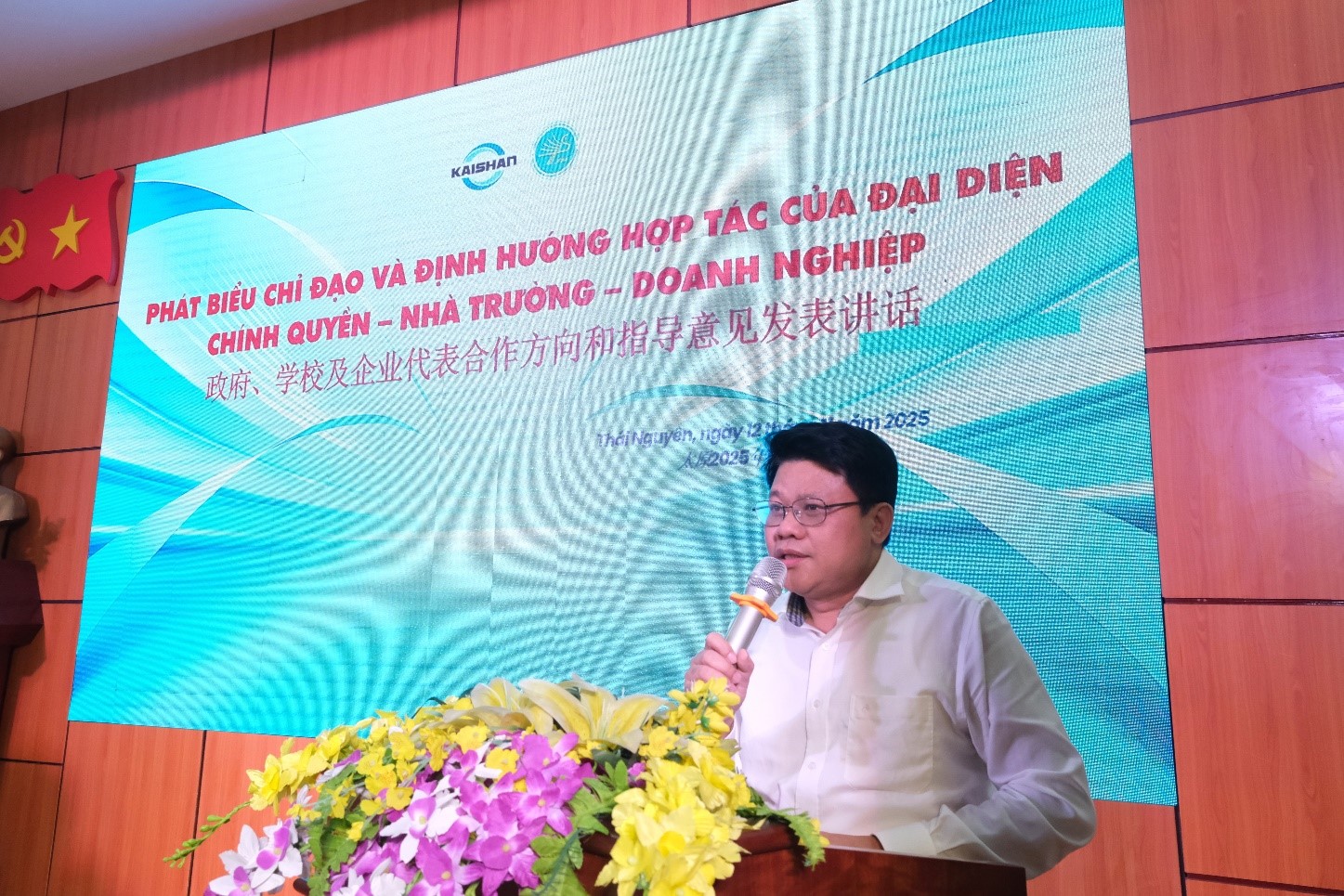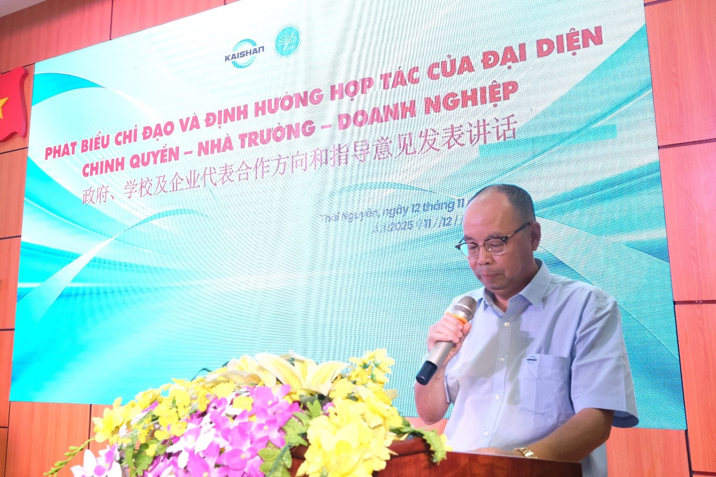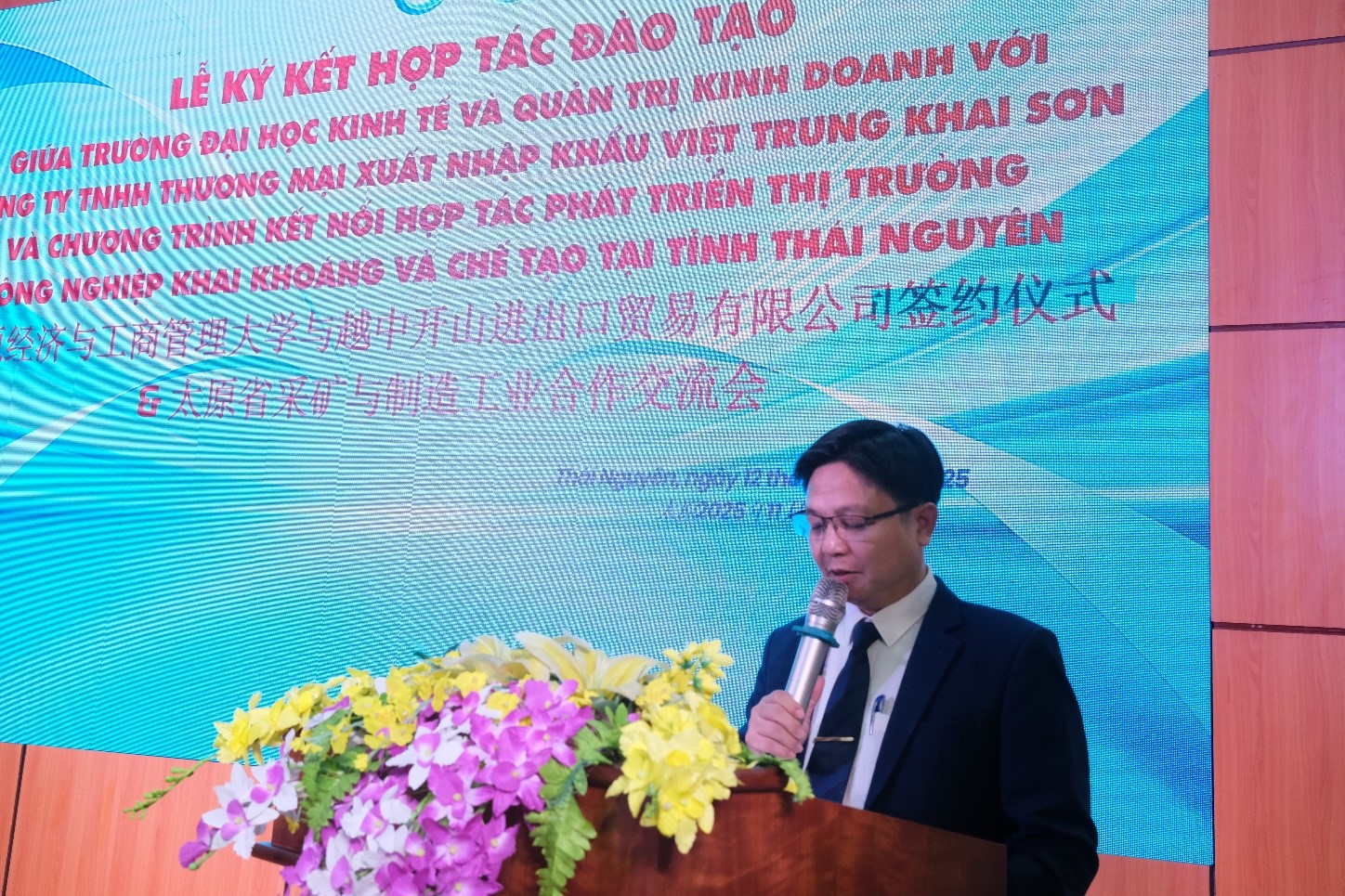 Ông Khương Ý - Chủ tịch Việt Trung Khai Sơn nhấn mạnh tiềm năng rất lớn của thị trường khai khoáng và chế tạo tại Thái Nguyên, đồng thời đánh giá cao sự chủ động thay đổi của Nhà trường trong thích ứng với xu thế thị trường.