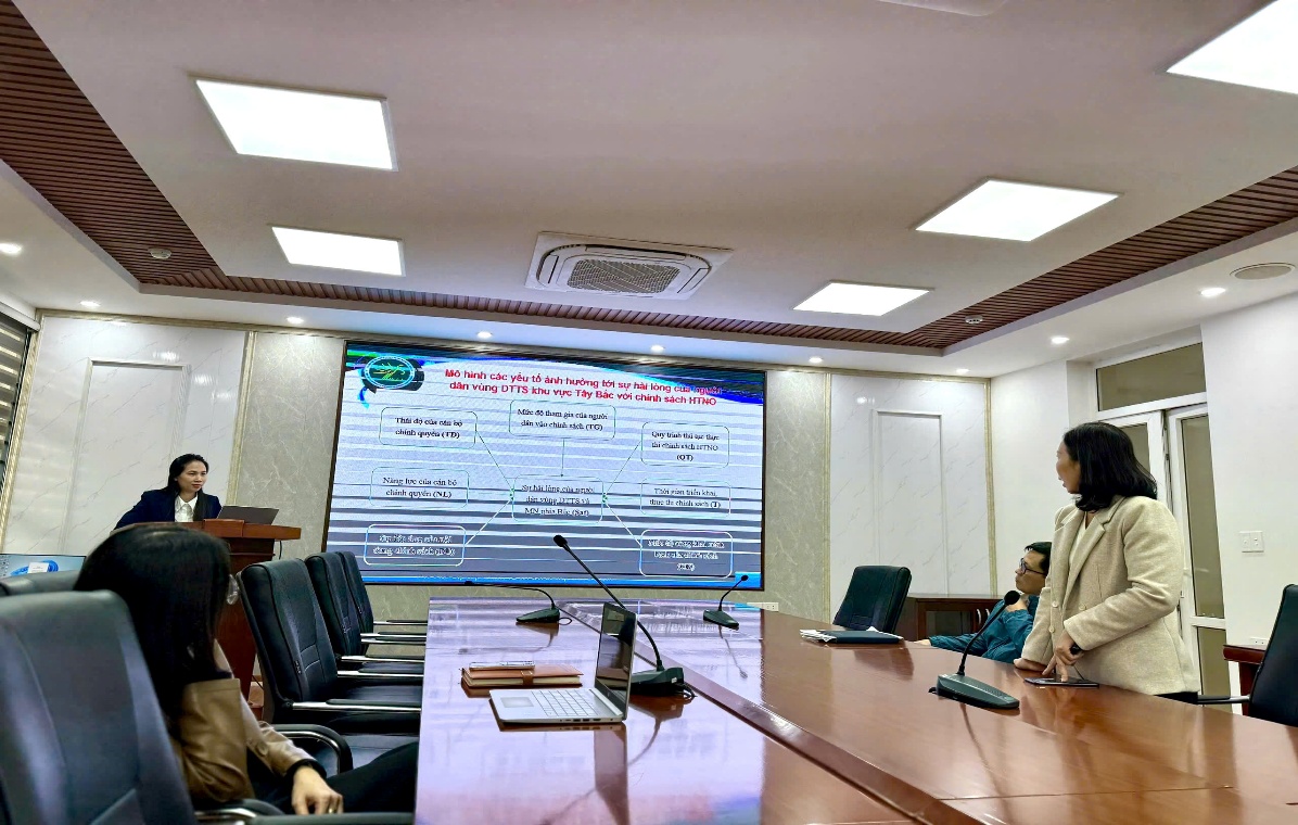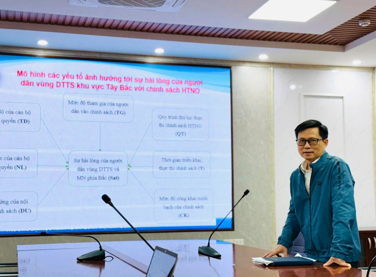 Tại buổi sinh hoạt, báo cáo viên đã trình bày một nghiên cứu điển hình về đánh giá chính sách hỗ trợ nhà ở đối với người dân vùng dân tộc thiểu số khu vực Tây Bắc. Nội dung trình bày tập trung vào việc xây dựng mô hình nghiên cứu các yếu tố ảnh hưởng đến mức độ hài lòng của người dân, thông qua hệ thống thang đo Likert và các biến quan sát cụ thể. Nghiên cứu đã xác định 7 nhóm yếu tố độc lập, bao gồm: mức độ đáp ứng của chính sách, năng lực và thái độ của cán bộ, mức độ tham gia của người dân, quy trình thủ tục, thời gian thực hiện và tính công khai minh bạch của chính sách.