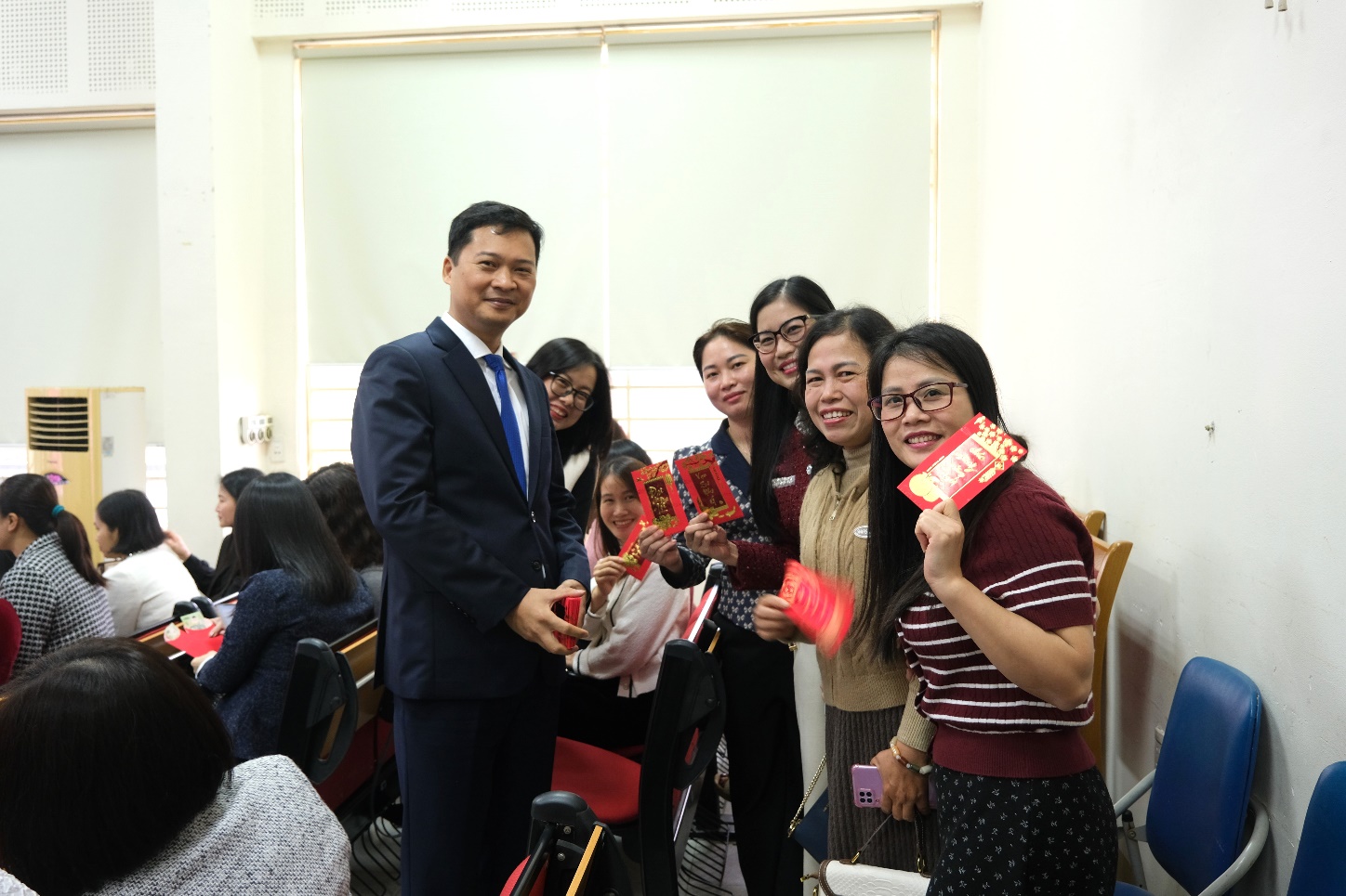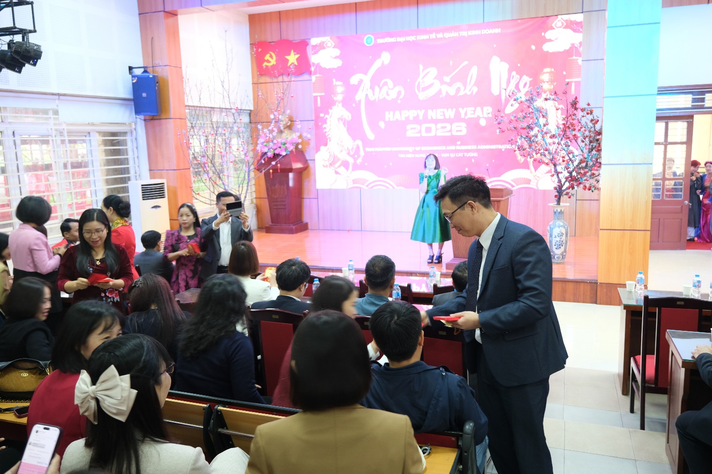 Không khí chương trình trở nên ấm áp hơn với hoạt động lì xì đầu xuân của lãnh đạo Nhà trường. Những phong bao đỏ không chỉ mang ý nghĩa may mắn, mà còn gửi gắm tình cảm, sự quan tâm và lời chúc an lành, thành công tới mỗi thành viên - tạo nên sự gắn kết rất riêng của mái nhà chung TUEBA.
