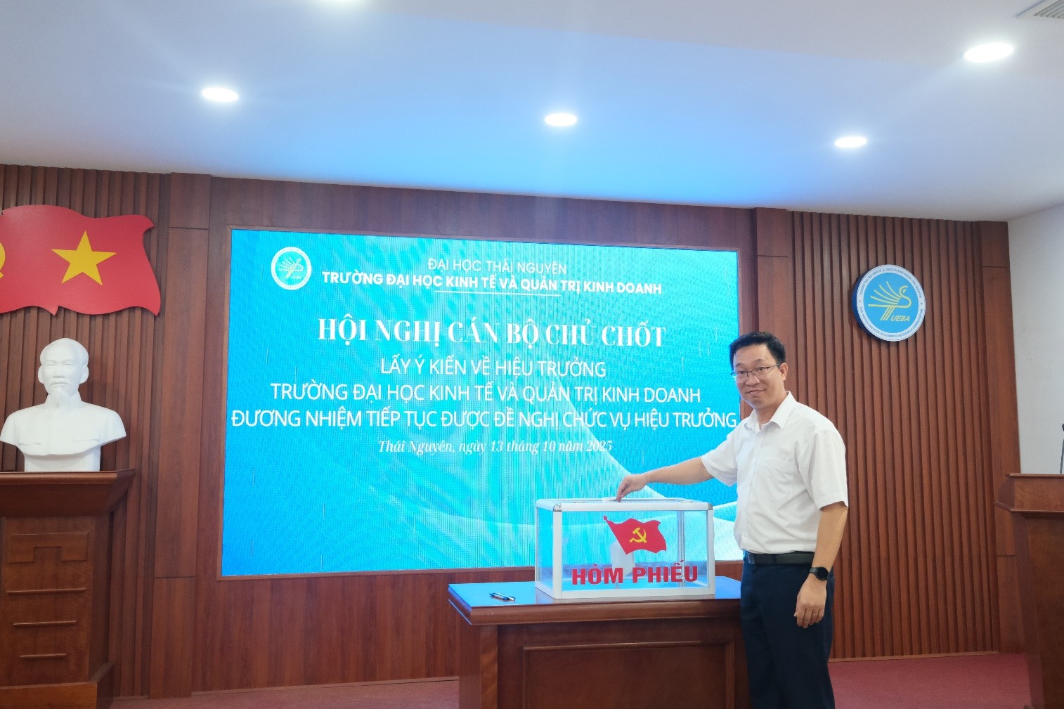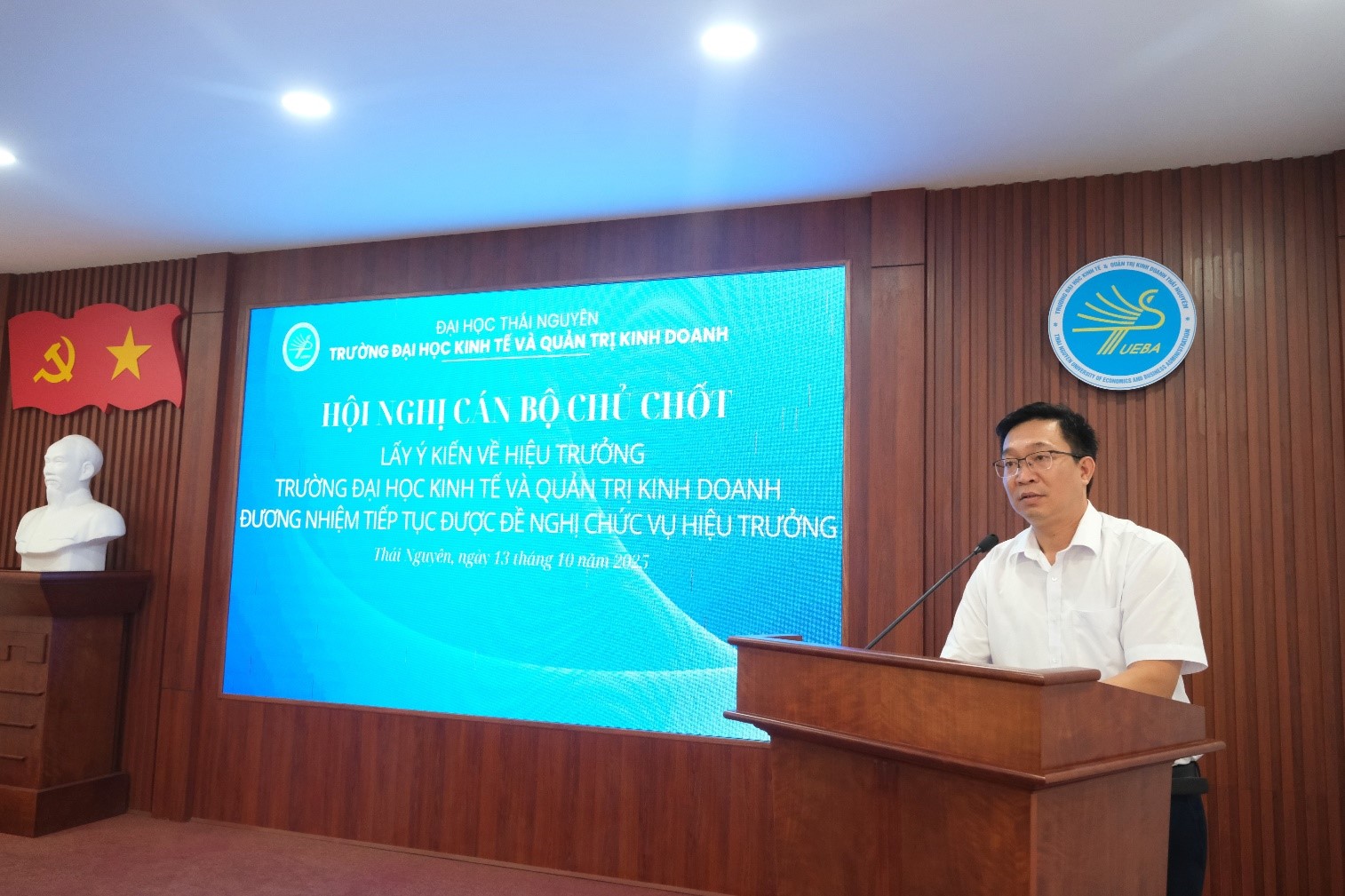 14/10/2025Ngày 13/10/2025, Hội đồng Trường Đại học Kinh tế và Quản trị kinh doanh (TUEBA) đã long trọng tổ chức Hội nghị cán bộ chủ chốt để thực hiện quy trình quyết định nhân sự Hiệu trưởng Trường nhiệm kỳ 2025 - 2030. Đây là một sự kiện có ý nghĩa đặc biệt quan trọng, thể hiện tinh thần dân chủ, trách nhiệm và minh bạch trong công tác cán bộ - một trong những nhiệm vụ trọng tâm của Nhà trường trong giai đoạn phát triển mới.