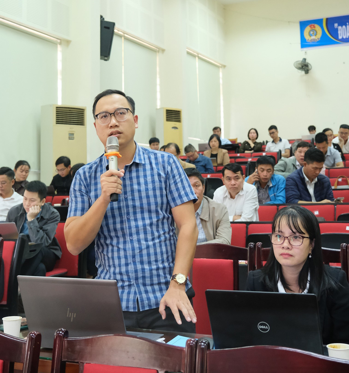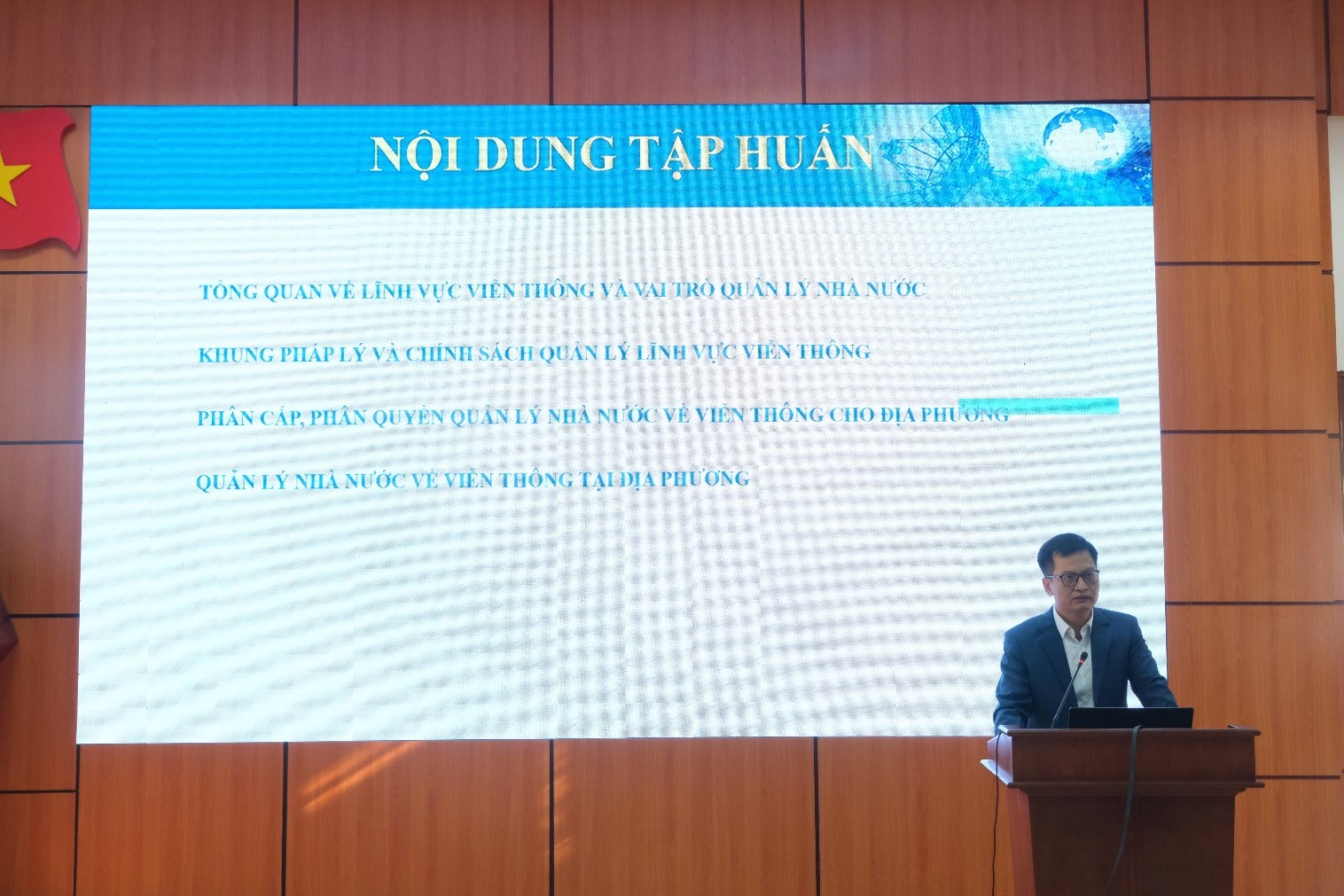 Đồng chí Trần Ngọc Dĩnh - Trưởng phòng Bưu chính - Viễn thông, Sở Khoa học và Công nghệ tỉnh Thái Nguyên báo cáo nội dung chuyên đề.