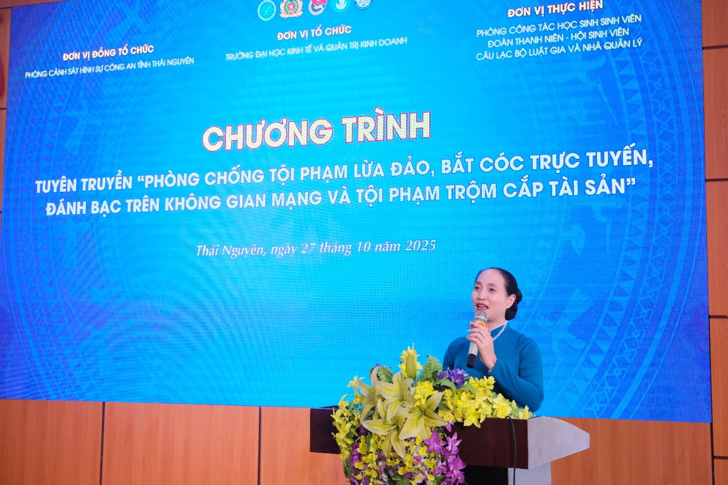 Phát biểu khai mạc, TS. Bùi Nữ Hoàng Anh nhấn mạnh: “Không gian mạng vừa là cơ hội, vừa là thách thức. Việc trang bị kỹ năng nhận diện và phòng tránh tội phạm mạng là nhiệm vụ quan trọng, giúp sinh viên TUEBA làm chủ công nghệ thay vì chỉ sử dụng công nghệ một cách đơn thuần; chủ động bảo vệ bản thân trong thời đại số và trở thành những công dân số thành công. Nhà trường luôn quan tâm và đồng hành cùng các lực lượng chức năng trong công tác tuyên truyền, phổ biến, giáo dục pháp luật và hỗ trợ sinh viên thực thi các quy định về phòng chống các loại tội phạm”. Lãnh đạo Trường biểu dương sáng kiến của Đoàn Thanh niên Cộng sản Hồ Chí Minh TUEBA trong việc phối hợp với Phòng Cảnh sát hình sự - Công an tỉnh Thái Nguyên tổ chức Chương trình. Đối với sinh viên TUEBA, Chương trình tuyên truyền không chỉ là hoạt động phổ biến kiến thức pháp luật, mà còn là một bài học thực tế quý giá về kỹ năng sống an toàn, ứng xử thông minh trong môi trường số.