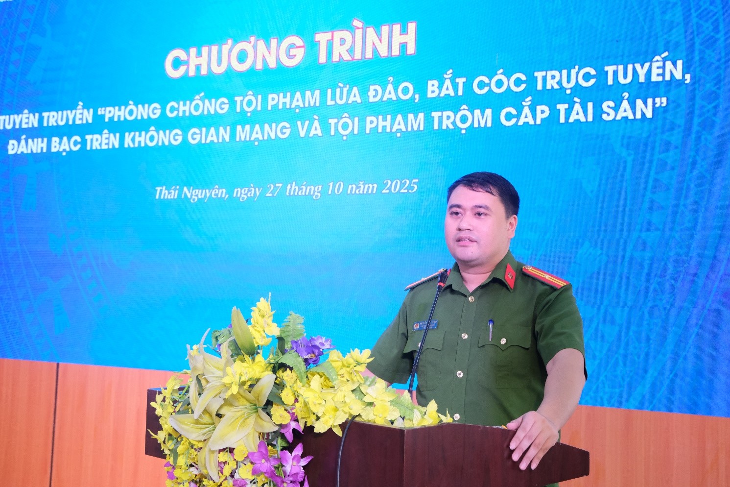 Tiếp đó, Thiếu tá Nguyễn Đức Thiện - Phó Bí thư Đảng ủy, Phó Trưởng phòng Cảnh sát Hình sự phát biểu đề dẫn, chia sẻ khái quát về thực trạng tội phạm công nghệ cao hiện nay, đặc biệt là các hành vi lừa đảo chiếm đoạt tài sản, đánh bạc, bắt cóc trực tuyến và trộm cắp tài sản xảy ra trên địa bàn tỉnh Thái Nguyên. Thiếu tá nhấn mạnh tầm quan trọng của việc phối hợp giữa lực lượng công an và Nhà trường nhằm tuyên truyền, nâng cao ý thức cảnh giác cho sinh viên - lực lượng trẻ năng động nhưng cũng dễ trở thành đối tượng bị lợi dụng.