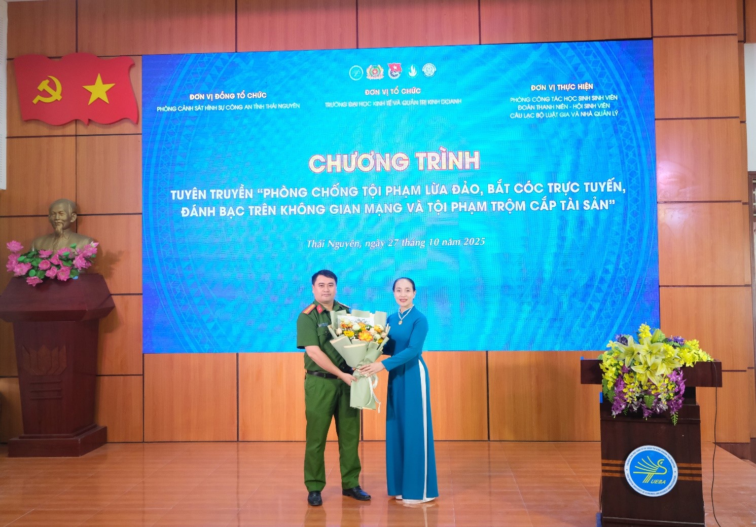 Nhằm nâng cao nhận thức, trang bị kỹ năng phòng tránh cho người học, ngày 27/10/2025, Trường Đại học Kinh tế và Quản trị kinh doanh (TUEBA) đã phối hợp với Phòng Cảnh sát Hình sự, Công an tỉnh Thái Nguyên tổ chức chương trình tuyên truyền chuyên đề: “Phòng chống tội phạm lừa đảo, bắt cóc trực tuyến, đánh bạc trên không gian mạng, tội phạm trộm cắp, chiếm đoạt tài sản” cho đại diện sinh viên của Nhà trường.